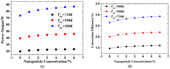Figure 5a,b show power output and conversion efficiency varies with concentration of Cu-EG nanofluid under different exhaust inlet temperatures. Within the figures, power output and conversion efficiency under EG-W cooling condition is also plotted for comparison. It can be found that power outputs and conversion efficiency under different concentrations of Cu-EG nanofluid are higher than that of EG-W at a fixed inlet temperature of exhaust, and the bigger the concentration of nanofluid is, the higher the power output and conversion efficiency will be. The reason is that Cu-EG has larger heat transfer coefficient than EG-W, leading to a bigger temperature difference between the cold side and hot side of the TEMs and then higher power output and thermoelectric conversion efficiency. The higher the concentration of nanofluid is, the better heat transfer performance the coolant will achieve, so the output performance increases with the rise of nanofluid concentration. It should be mentioned that the concentration of nanofluid always has an upper limit considering the stability of nanofluid. Thus, the concentration of Cu-EG nanofluid discussed in this study is less than 6%. Through the comparison within Figure 5a, we can find that the variation trends of power output under different exhaust inlet temperatures are almost the same. The difference is only the value of power output, which enhances dramatically with the increase of exhaust inlet temperature when the concentration of the nanofluid is fixed. This is because the increase of inlet temperature of the exhaust will increase the heat transferred to hot side of the TEMs and will result in a larger power output as mentioned, in Section 3.1. From the analysis in this section, the conclusion can made that increasing concentration of Cu-EG nanofluid within a realizable range has a positive effect on the output performance of the TEG system.
