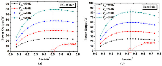Figure 6a,b describes power output variations with total area of TEMs for Cu-EG nanofluid and EG-W cooling conditions, respectively. It can be obviously seen from Figure 6a,b that power output rises significantly at first and then drops slightly as increasing total area of TEMs for both cooling conditions under different inlet temperatures of exhaust, indicating that optimal total area of TEMs exists for maximizing output performance of the TEG system. It is interesting to note that the optimal total area of the TEMs is independent of the inlet temperature of exhaust for both cooling conditions. As can be seen from the figures, the optimal total area of TEMs is 0.5063 m2 for EG-W cooling condition and 0.4375 m2 for Cu-EG nanofluid cooling condition with concentration of 3%. This is because the variation trends of temperature difference across thermoelectric modules are almost the same under different exhaust inlet temperatures. Therefore, the variation trends of power output under different exhaust inlet temperatures are almost the same, and the difference is only the value of power output, as already mentioned in Section 3.2. In considering the independency with inlet temperature of exhaust, this feature will have significant meaning for heat recovery from engine exhaust with fluctuating characteristics.