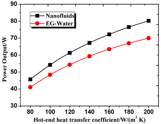 In this section, all discussions are based on the following conditions: the concentration of Cu-EG nanofluid is 3%, the mass flow rate of exhaust is 0.02 kg/s, and the inlet temperature of exhaust is 620 K. Power output variation with hot side heat transfer coefficient of TEMs is presented in Figure 7 when using Cu-EG nanofluid and EG-W as coolants for cold side of TEMs. As can be seen from Figure 7, power output increases as hot side heat transfer coefficient of TEMs increases, and power output under Cu-EG nanofluid coolant is larger than that of EG-W coolant. Moreover, the power output difference between Cu-EG nanofluid and EG-W coolant keeps increasing with the increase of hot side heat transfer coefficient of the TEMs. When hot side heat transfer coefficient is 80 W m2 K−1, power output enhancement is 4.6 W (11.2%). When hot side heat transfer coefficient rises to 200 W m2 K−1, power output enhancement rises to 11.2 W (14.6%). This can be explained as follows: due to higher heat transfer coefficient of hot side of TEMs, more heat is transferred to hot side of TEMs, resulting in a higher hot side temperature. Meanwhile, using Cu-EG nanofluid as coolant for cold side of the TEMs reduces cold side temperature of the TEMs. The higher heat transfer coefficient of hot side is, the larger temperature difference between hot and cold side of the TEMs. Therefore, power output enhancement under Cu-EG nanofluid coolant is larger than that of EG-W coolant as the increase of hot side heat transfer coefficient of the TEMs. From the perspective of synergy effect on heat transfer enhancement for hot side of the TEMs, Cu-EG nanofluid as coolant for cold side of the TEMs is also superior to EG-W coolant.