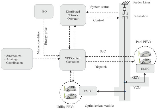 In this work, the coordinating unit is called the central controller (CC), for simplicity. The role of the CC is to optimise energy generation, storage and consumption. Therefore, throughout this paper, VPP controller and CC are used interchangeably. PEVs are gaining acceptance as sources of dispatchable energy [7,8,9]. Their ability to release stored energy to the grid empowers end users hitherto considered as mere consumers to become active stakeholders as producers and consumers (prosumers) of electricity. This paradigm shift allows bi-directional power flow between the grid and prosumers. This study is carried out within the Triangulum; one of the lighthouse projects funded by the European Union (EU) aimed at transforming designated European cities into smart quarters. The test bed comprises Manchester, Eindhoven and Stavanger with Prague, Leipzig and Sabadell as the follower cities. The project has been organised into mobility, energy and information and communications technology (ICT). Within the mobility work stream, this paper investigates the economic benefits of smart decentralised coordination of PEV power flow by optimising the grid-to-vehicle (G2V) and vehicle-to-grid (V2G) operations in the VPP. As a deviation from most existing work in the area, this paper focuses on optimal power flow from the prosumer’s point of view to maximise the economic benefits using price as the main driver. Therefore, issues such as voltage and loading constraints are not addressed here.