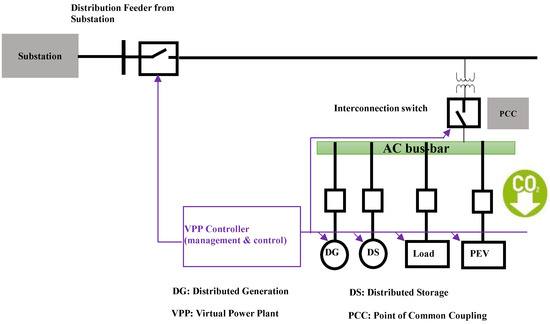 According to the United Nations Environment Program (UNEP) report [2], district energy systems, such as the virtual power plant (VPP), can create a pathway to transit from intense use of fossil fuel and achieve a 30–50% reduction in primary energy consumption by harnessing renewable resources. This is also in line with regional mandates such as the European Commission’s 20-20-20 strategic objective to increase renewable uptake by 20% by the year 2020 and ensure a low-carbon economy by 2050 [3,4]. Although renewable uptake is increasingly explored [5], its sources are intermittent in nature, which can lead to voltage fluctuations and loss of loads. This can be compensated by energy storage systems [6] including battery banks in plug-in electric vehicles (PEVs). VPP provides a platform for smart coordination of distributed energy sources and loads in geographically-dispersed environments such as educational campuses, industrial parks and small communities. By integrating distributed energy resources (DERs) such as wind-turbine, micro-CHP, hydro-sources, photovoltaic systems (PV), storage and PEVs, the resulting network of energy resources and loads can be managed as a single entity.