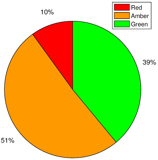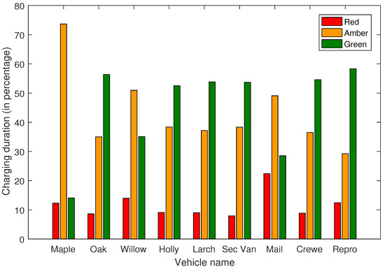 This tariff, shown in Table 2, is applied throughout this paper. The distribution of this energy usage across the different tariff regimes is presented in Figure 3. The figure reveals that within the charging duration, red, amber and green tariffs account for 10%, 51% and 39% of the total charging period, respectively. However, analysis of the tariff shows that the red, amber and green periods accounted for 6%, 37% and 57% of the total duration of a typical tariff week. One expects that the vehicle charging distribution would at least follow the same pattern as tariff periods; in reality, that was not the case. The distribution of charging duration across tariff regimes for individual vehicles in Figure 4 shows that some of the PEVs follow a charging trend similar to the tariff period distribution. Oak, for example, had 9%, 35% and 56% of its charge duration during the red, amber and green tariff periods, respectively.