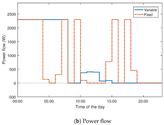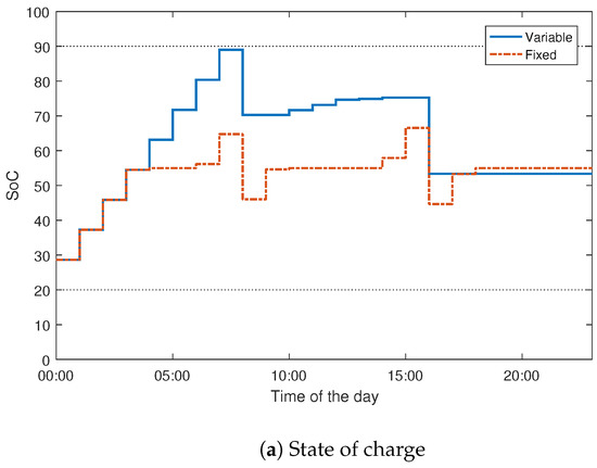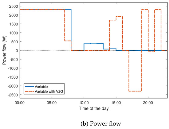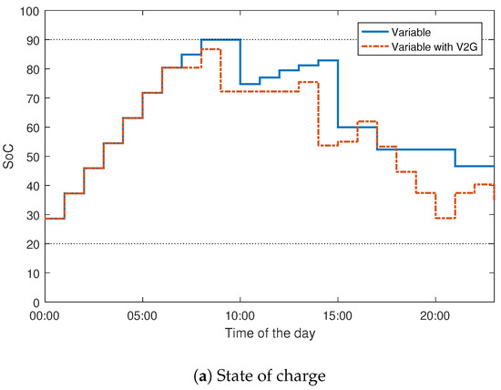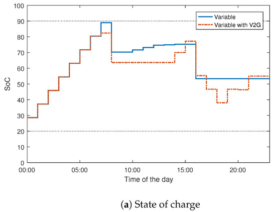 The plots showing the SoC of the vehicle battery and energy consumption during the day for the fixed tariff (i.e., without optimisation) and actual tariff without V2G are presented in Figure 6. The results show that for the algorithm with a fixed tariff, charging occurred even during the peak period. However, for the algorithm with a varying tariff, charging occurred only during periods of low tariff (mostly before 9:00 a.m.). This will ensure a reduction in energy cost for vehicle charging.