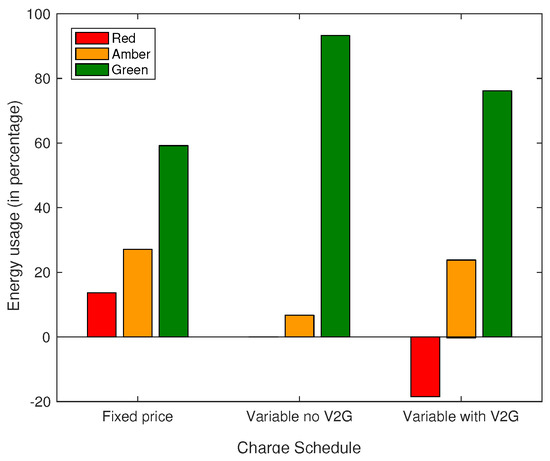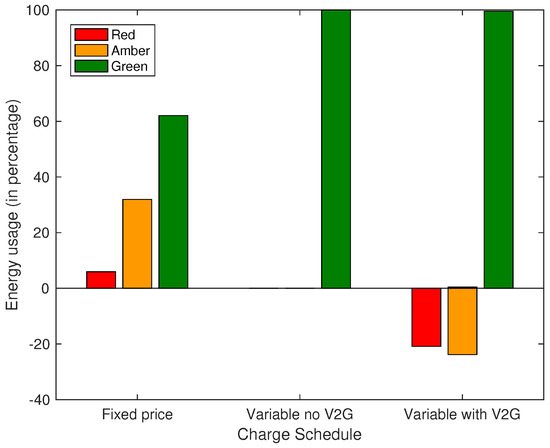 In the case of pool vehicles, Monte Carlo simulation was applied. To achieve this, 1000 different coordinating unit patterns uniformly distributed between distances of 20 km and 42 km, i.e., , were generated. The timings for driving out and back to the station were also generated (also uniformly distributed between 9:00 a.m. and 4:00 p.m.), i.e., , to reflect the collected data in Section 2.3. For this class of vehicles, usage was restricted to weekdays. Using a fixed price, a variable price without V2G and a variable price with V2G, an algorithm was developed for each scheme to charge the PEVs. Each of the charging schemes was applied to the 1000 samples of vehicle usage patterns. Average energy usage for the three charging schemes (fixed, optimal without V2G and optimal with V2G) across the three tariff periods is shown in Figure 9.