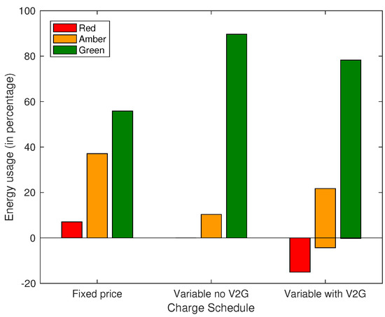 To account for non-work-related journeys (e.g., shopping and leisure), it was further assumed that the PEVs embarked on longer trips once every month on weekends. The schedule for weekends is different. Moreover, the availability of charging stations in shopping and other leisure areas is not always guaranteed. However, for easier analysis and to allow for some allowance, the same schedule is assumed during weekends. A breakdown of energy usage for vehicle charging across the tariff regimes is presented in the bar chart presented in Figure 8. The positive bars show the percentage distribution of total energy usage for the different charge schedules. The negative bars on the other hand show the energy transferred to the grid as a percentage of the total energy used in battery charging. For the fixed price schedule (without optimisation), the red, amber and green tariff periods accounted for 14%, 27% and 59% of PEV charging energy. This is similar to the usage of vehicles (such as Oak, Holly, larch, Sec van and Crewe) in the Triangulum fleet as shown in Figure 4. For the optimised scheme with actual variable electricity price without V2G (variable, no V2G), no charging occurred during the red tariff period. The amber and green tariff periods accounted for 7% and 93% of the PEV charging duration, respectively. For the optimised scheme with V2G, no charging occurred during the red tariff period. The amber and green charging periods accounted for 24% and 76% of the charging energy. V2G operation occurred only during the red tariff period, and 19% of the energy used in charging was transferred back to the grid. This resulted in average savings of 63% and 55% in the cost of PEV charging for the optimised charging with and without V2G, respectively.