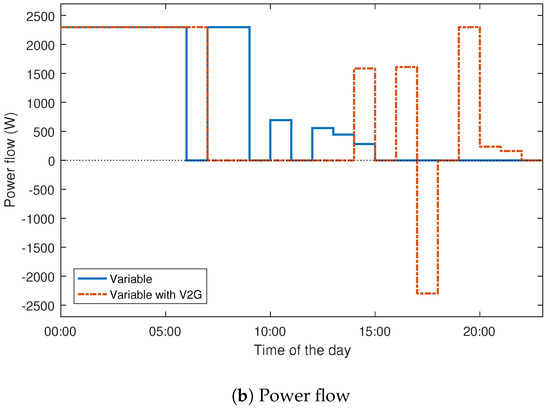 According to Figure 11, V2G only occurred during the peak price. The average savings in the cost of PEV charging due to optimised charging with and without V2G was 31% and 14%, respectively.