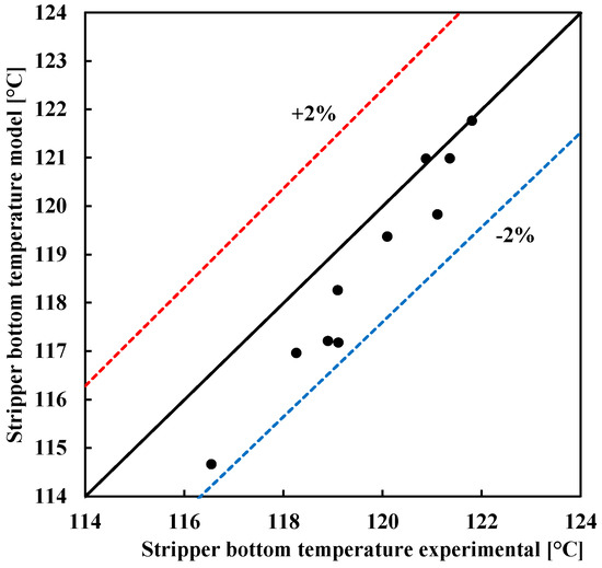Parity plot for stripper bottom temperature for the 10 steady-state operation cases. Lines for +2% and −2% percentage errors are shown. The mean percentage error is 0.86 for stripper bottom temperature.