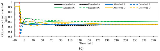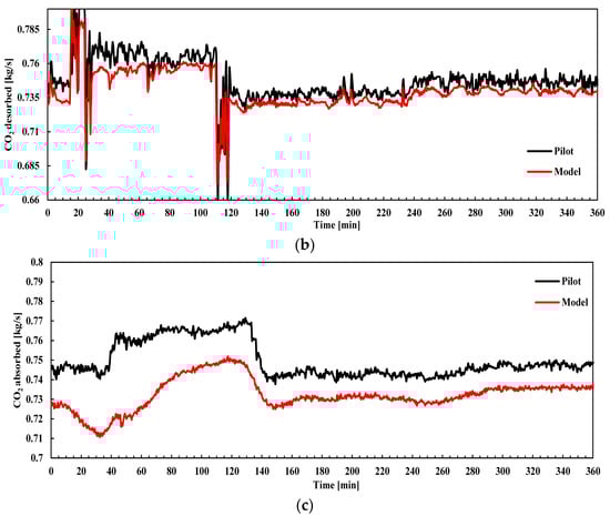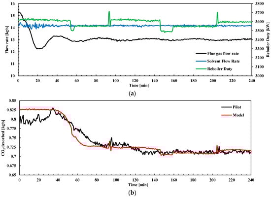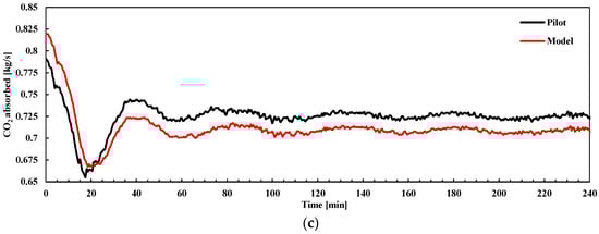 Figure 5b,c show the output trajectories of CO2 product flow rate (or CO2 desorbed) and CO2 absorbed to the disturbance applied in this test. CO2 absorbed is calculated as the difference between CO2 mass flow rate at the absorber inlet and the CO2 mass flow rate leaving the absorber with the depleted flue gas at the top of the absorber; refer to Equation (12). In Figure 5b, a dead time of around 40 min was observed, i.e., no significant changes are found in the CO2 desorbed until around 40 min after the disturbance was applied to the pilot plant. In addition, the plant did not reach steady-state operating conditions until around 4 h later. As shown in Figure 5c, there is not significant dead time in the response of CO2 absorbed. The difference observed between the output trajectories is characteristic of the coupled transient performance of the absorber and stripper columns. Figure 5b,c shows that the process model is capable of predicting the main process dynamics for CO2 product mass flow rate (CO2 desorbed), including an adequate prediction of dead times and stabilization time. In addition, the CO2 absorbed transient performance trends are predicted in a satisfactory manner.