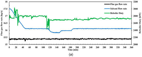 Online solvent analysis measurements (SA) were taken at the inlet (SA1) and outlet of the absorber (SA2); refer to Figure 1. The measurements include pH, density and conductivity. In addition, solvent samples were regularly taken manually and analyzed onsite. These analyses allow MEA concentration and CO2 loadings to be calculated at the sampling points on a periodic basis. The actual reboiler duty was estimated as suggested in Thimsen et al. [52]. Equation (1) shows the calculation of the actual reboiler duty, where is the logged measurement data of steam mass flow rate (refer to FT4 in Figure 1), is the condensate temperature, is the superheated steam inlet temperature, is the steam pressure at inlet, and is the condensate pressure. Enthalpy was calculated with the use of accurate steam tables, with the condensate at the reboiler outlet assumed to be saturated liquid at or . The specific reboiler duty (SRD) in kJ/kgCO2 is calculated as in Equation (2), where Fprod is the CO2 rich product mass flow rate; refer to FT3 in Figure 1.