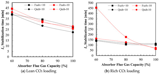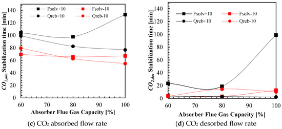 The detailed results of the process simulations are presented in Table A1, Table A2 and Table A3 in Appendix A. Figure 8 shows the total stabilization times for the selected process variables at the three operating points, for step changes in solvent flow rate and reboiler duty. The responses for step changes in flue gas flow rate are not presented, since it is shown in Table A1 that the relative change RC in the output process variables is very small or negligible (RC ranges from −0.81% to 0.21%). This can be explained by the highly diluted nature of the CO2 in the flue gas (ca. 3.5 vol%). The results show the non-linear behavior of the plant, with different transient responses to step change set-point increase and decrease in key plant inputs, and at different loads of the plant.