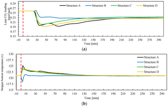 A power plant operated in a power market with a high penetration of renewables will most likely be operated in load-following mode [7,63]. This means that the power plant with PCC will be operated during a significant amount of its lifetime at part loads. In the case of a natural gas combined cycle power plant with post-combustion CO2 capture it means that, at part-load operation, the gas turbine (GT) load will be reduced, generating a reduced mass flow rate of flue gas that would be conducted to the PCC unit. The purpose of this case study is to investigate the transient performance of the PCC pilot plant via dynamic process simulation by implementing open-loop step changes to the dynamic process model, and to compare the response of the plant at different part-load operating points, defined by different mass flow rates of flue gas to be treated. The analysis will assess the transient response of the plant to multiple and non-simultaneous step changes in three key inputs to the plant, namely (i) flue gas flow rate Fgas (ii) solvent flow rate Fsolv; and (iii) reboiler duty , at different flue gas mass flow rate capacities of the plant. In order to define the part-load operating points, a decentralized control structure was utilized, in which reboiler duty was the manipulated variable to control stripper bottom temperature Tstr to 120.9 °C, and the solvent flow rate was the manipulated variable to control CO2 capture ratio Cap to 0.85, as defined in Equation (13). When operating the plant at different flue gas mass flow rates, corresponding to 100%, 80% and 60% of nominal mass flow rate, this results in the three steady-state operating points presented in Table 5 and Table 6. The control structure is defined as control structure A in Table 7.