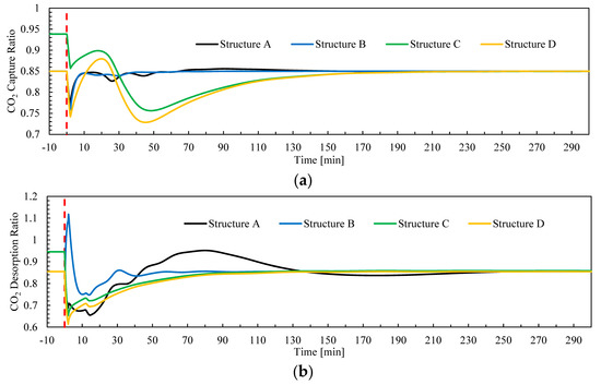 The open-loop response was studied for the process variables (i) CO2 absorbed CO2,abs, in Equation (11); (ii) CO2 desorbed CO2,des (or Fprod); (iii) lean CO2 loading Ll at the inlet of the absorber; and (iv) rich CO2 loading Lr at the outlet of the absorber. To characterize the transient response, dead time θ, settling time ts, total stabilization time tt, and relative change (RC) were calculated: