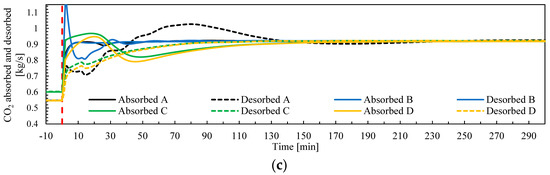 Carbon capture and storage (CCS) is a group of technologies that can significantly contribute to the reduction of anthropogenic CO2 emissions from thermal power generation and other carbon-intensive industries [1]. There are two commercial-scale coal-fired power plants with post-combustion CO2 capture (PCC) using amines being operated today, at Boundary Dam in Canada [2] and at Petra Nova project at the Parish Power Station in the US [3]. These projects prove the technical feasibility of the technology at commercial scale. Among the different options and technologies for CO2 capture in thermal power generation, post-combustion CO2 capture with chemical absorption is considered the more mature technology that can contribute to significantly reducing the carbon intensity (kgCO2/kWhel) of fossil-fueled thermal power plants. In future energy systems with a high penetration of renewable energy sources, the variability in demand and generation will introduce a change in the operating patterns of thermal power generation plants, which will have to change operating conditions [4,5,6]; there will also be a higher frequency of significant transient events including load changes, and start-up and shut-down events [7,8]. In this regard, Boot-Handford et al.’s carbon capture and storage update 2014 concludes that the financial case for CCS requires that it operates in a flexible manner and that load-following ability is extremely important to the long-term economics [9].