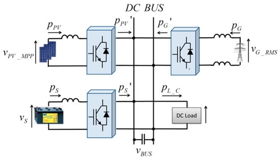 Microgrids can be both alternating current (AC) and DC, depending on the form of the current on the common bus. Noting that the PV generator and the widely applied electrochemical batteries are both native DC components, and the fact that more and more electric equipment can be supplied by DC distribution, the DC microgrid is more energy efficient since it consists of fewer power conversion stages [5]. The simplified architecture of a typical grid-connected DC microgrid is depicted in Figure 1. The renewable energy source, i.e., PV panels, the electrochemical storage, and the AC distribution grid are connected to a common DC bus via dedicated power converters. The loads are also connected to the DC bus, either directly or via their dedicated converters; but, from an energy point of view, the loads and their converters can be seen as a single DC load directly connected on the DC bus. It is noted that νBUS, pPV, pS, pG and pL_C are respectively the common DC bus voltage, the power of the PV source, the electrochemical storage, the power exchanged with the public grid and the constrained load power; and also , and are the powers exchanged with the common bus by the corresponding converters, respectively. More detailed introduction about the variables will be given in Section 3.