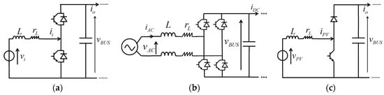 In a DC microgrid two kinds of power converters are involved: the DC/DC converter and the DC/AC converter. Their main mission is to interface the sources with the DC bus and to flexibly control the exchanged power. Although a lot of different power converters have been conceived for this purpose, this work studies only the half-bridge DC/DC converter, the full-bridge DC/AC converter and the basic boost converter as illustrated in Figure 2a,b.