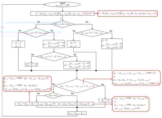To compensate the converter losses, the second method takes into account some extra consumed power, namely PSM, when comparing and the available power. This can be easily realized by replacing the formulas marked with (i) by those marked with (ii) in Figure 3. However, the sizing of the PSM must be properly made: too high a value leads to unnecessary load shedding and waste of power; a small value can be insufficient to cover all the power losses and avoid the failure of microgrid system. This choice is usually made empirically and mostly as a high value.