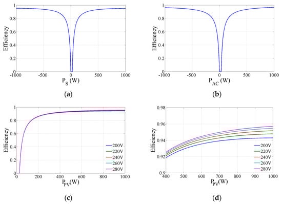 The converter efficiency curves based on the parameters given in Table 1 are shown in Figure 4. Figure 4a,b show that the maximal efficiencies of the converters associated with the storage and grid are both about 96% in the range of 1 kW and the variation of the efficiency is clearly demonstrated by the estimation. It can be noted as well that in a small range of source power above zero, the efficiency keeps at zero. This is because the input power is not more than the generated power loss and output power is zero. Regarding the converter associated with the PV generator, the influence of the input voltage on the efficiency is also given (Figure 4c). Nevertheless, following Figure 4d, it can be concluded that in the scope of 200–280 V the difference of efficiency is really negligible. In addition, as the half bridge DC/DC converter generates the same amount of power loss as the basic Boost converter, the efficiency curve can represent both converters.
