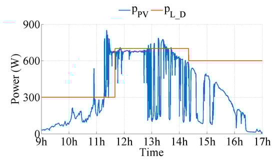 In this first subsection, three algorithms are compared for the same PV MPPT power profile pPV recorded on the 6 November 2014. This day is a typical case of solar irradiation evolution in northern France, which includes relatively high irradiation and the variations caused by clouds. The load power demand profile pL_D is a simplified one to make the analysis easier. These powers are presented in Figure 5.