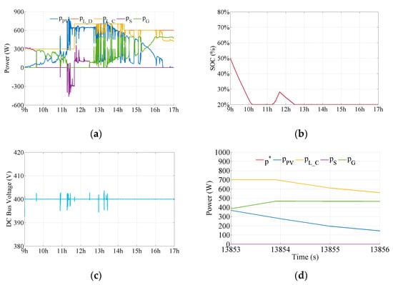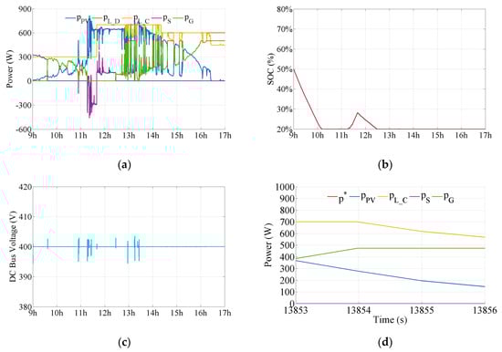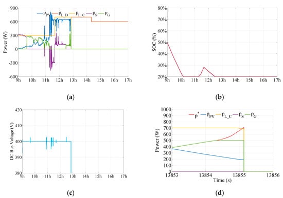 Firstly, the classic power balancing without PSM and no DCE is tested. From Figure 6a it is seen that the microgrid has been cut out right before 13:00. This is because the bus voltage has fallen out of the safe range a few minutes before 13 h as shown in Figure 6c. Figure 6b depicts that the lower limit was reached before the failure, so the system relied only on the grid power to keep the power balance. As the grid power is supposed to be limited at 500 W, the output power of grid converter is evidently saturated at a value of less than 500 W.