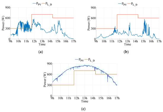 PV and load power profiles: (a) PV power profile of 13 November 2014; (b) PV power profile of 27 January 2015; (c) PV power profile of 12 March 2015.