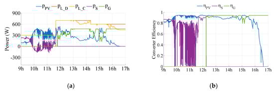 Figure 10a,c,e show that the load shedding is highly dependent on the PV production. For example, on 27 January 2014, a day when the solar irradiation is obviously low, the load has been severely shed. On the contrary, on 12 March 2015, there was almost no load shedding because of excessive PV power. Figure 10b,d,f demonstrate that the efficiency of the PV converter depends on the PV power as well. On the first and last day, the PV converter worked constantly with high efficiency, except for the end of the day. But on 27 January 2015 the efficiency was highly variable and it should not be treated as a constant. Concerning the power converters of the storage and the grid, the situation is more complicated since the auxiliary source power depends on both the available PV power and load power demand. No matter whether there was a lot of or just a little PV power, the storage and grid associated converters invariably worked with relatively low efficiency for some time. This fact justifies the introduction of DCE in the control of microgrid.