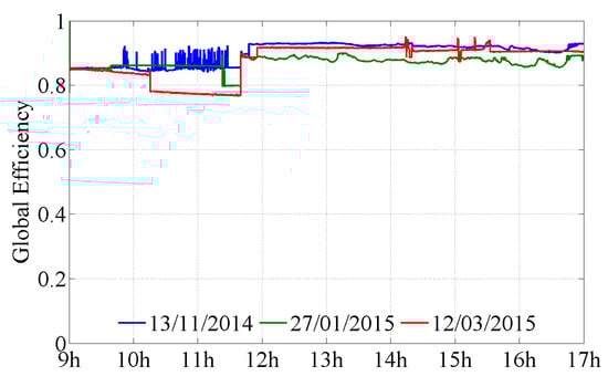 Taking into account the variation of converter efficiencies during the studied period, it is obvious that the global efficiency of the DC microgrid has also some fluctuation. Figure 11 shows the evolution of instant global efficiency, defined as , for the DCE method. It can be seen clearly that the global efficiency does not have a direct relation with PV profile. The fluctuation of the blue curve was evidently caused by the fluctuation of PV power, but the highest PV power on the 12 March 2015 did not correspond to the highest global efficiency. On the contrary, during some period, this day has the lowest global efficiency. This implies that the improvement of the global efficiency may need optimization of power flow dispatching in the microgrid with prediction of PV power generation and load power demand.