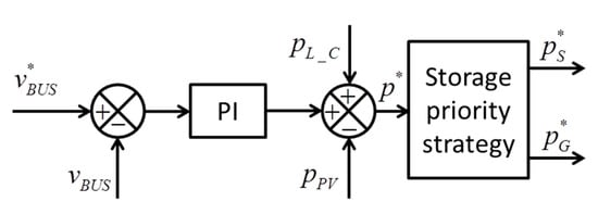 where and are respectively the proportional gain and the integral gain of a proportional-integral (PI) regulator, and is the power reference needed to keep the power balance, i.e., DC bus voltage stabilization. This power reference is then divided into the storage power and grid power references, and , according to the energy management strategy. One popular strategy is the storage-priority strategy, meaning the total power reference will be always assigned to the storage unless the storage is exhausted or exceeds the storage power range.