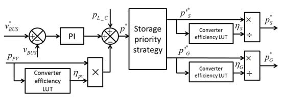In this way, the total power reference is divided into two parts and , according to the storage priority strategy. However, as stated in Section 4, the strategy does not consider the power losses and it depends on the robustness of the regulator to compensate the power losses. As a result, the process of the convergence will lead to more bus voltage oscillations, thus the power quality is degraded. In order to accelerate the convergence and improve the power quality of the DC microgrid, a feed-forward method based on estimation of efficiency can be introduced in the control loop. Thus, the following loop is implemented instead of the one above (Figure 13).
