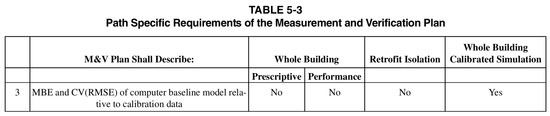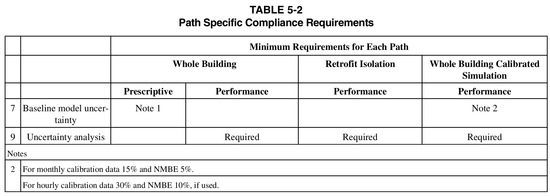 - Table 5-2 Path Specific Compliance Requirements sets out the minimal requirements for three specific approaches: (a) whole building, (b) retrofit isolation and (c) whole-building calibrated simulation. Points 7 and 9 of this table (baseline model uncertainty and uncertainty analysis respectively) explain that the uncertainty analysis of the calibrated simulation is required, establishing its limits in “Note 2”. The limits established in this note are those summarized in Table 1. In the note, the abbreviation of has been omitted. It is assumed to be the first values. Figure 1 is a fragment of this table.