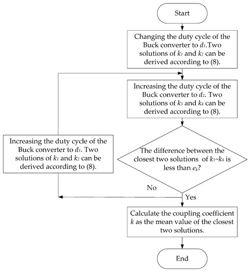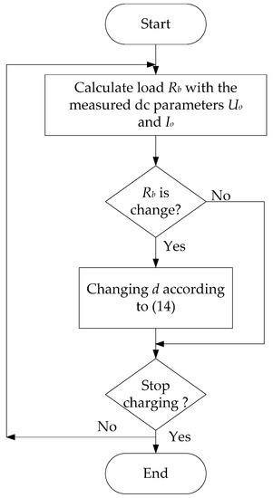 Figure 5 shows the flowchart of the maximum power transfer tracking process. After the identification of the coupling coefficient and the load resistance, MPTT can be realized through impedance matching (i.e., changing the duty cycle of the Buck converter). Load Rb is detected during the whole charging process. If Rb is varied, the optimum duty cycle d derived by Equation (14) will fed to the Buck converter.