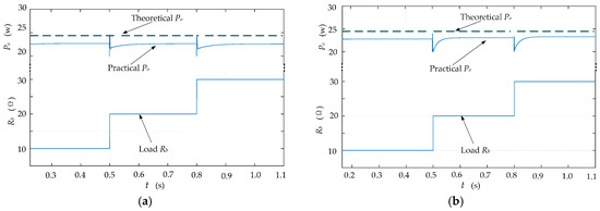 As for the MPTT of the system, the simulation results are shown in Figure 8. Rb changes from 10 to 30 Ω, and two coupling coefficient cases are considered (the given coupling coefficients are 0.0448 and 0.0811, while the identified coupling coefficients are 0.0474 and 0.0839). The theoretical maximum power can be derived from (12), which are shown in the top of Figure 8a,b with dot line. The middle of the figure indicates the practical output power while the load Rb variation is shown in the bottom of the figure. Both the two figures (a) and (b) share the similar features, due to the identification error of k and the non-ideal of the semiconductor switch and diode, the practical output power is slightly lower than the theoretical value. The steady state of the practical output power (Po) is almost the same at different load condition, this can prove that the maximum power tracking is achieved. At the changing instant of load Rb, the practical output power is pulsatile due to the switch noise, and it cannot be totally eliminated.