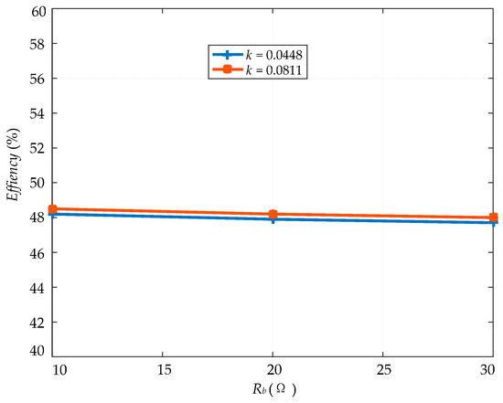 System efficiencies at steady state under these two coupling coefficients are shows in Figure 9. In general, the output power is at its maximum when the external resistance is equal to the internal resistance, so the efficiency under the maximum power transfer condition is close to 50%.