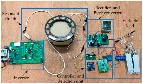 An experimental setup is built to verify the proposal. The experimental system topology is same with Figure 1 and Table 1 gives its parameters. In the experiment, the primary and secondary coils are in same configuration and wound by Litz wires. The diameter of the coil is 14 cm, while the number of turns is 25. Figure 10 shows the photo of the experimental setup, where an ARM chip is used as the detection unit to measure the DC voltage and current, while an FPGA chip is selected as the controller. The variable load is achieved by switching the relay array.