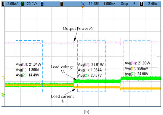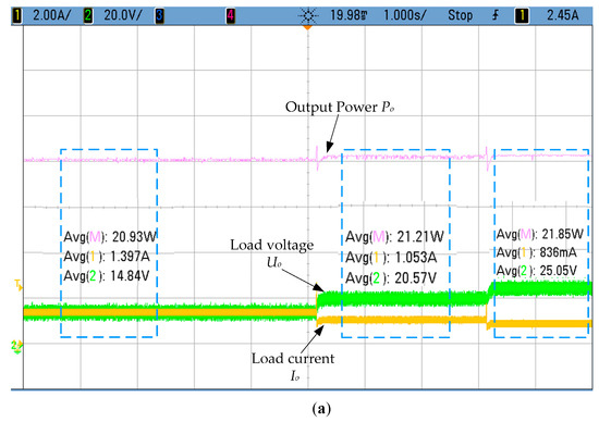 The top of the figure shows the practical output power, while the bottom of the figure shows the detected voltage Uo and current Io. By comparing Figure 11a,b and Figure 8a,b the experimental output power is slightly smaller than the simulation results because of the identification error of k and the losses in the experiment system. When load Rb changes, the tracked maximum output power is almost the same at the steady state, this can prove that the maximum power tracking is achieved.