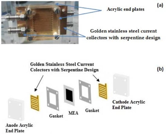 The cell comprises two acrylic end plates and two golden stainless steel current collectors with serpentine design (machined by MicroSystems, Warrington, UK). The single-serpentine flow field design is shown to be one of the most favorable for the micro DMFC [