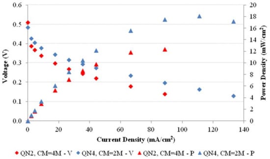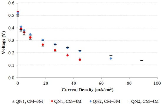 The polarization curves obtained by operating MEAs QN1 and QN2 with different methanol feed solutions are plotted in
