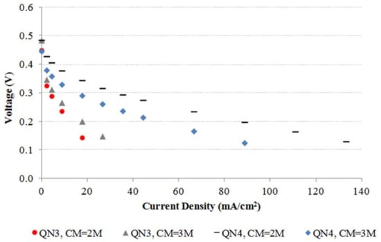 Figure 3 the polarization curves for different methanol solutions for MEA’s QN3 and QN4 are presented.