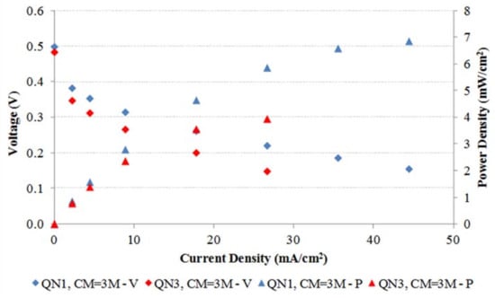 The MEA QN1 was also tested for 2 M methanol concentration because the performance obtained with 3 M is slightly higher in the last part of polarization curve, generating higher power densities. However, the performance found for 2 M was lower; therefore the optimum methanol concentration for this MEA is 3 M. For the MEA QN2 the same procedure was followed with a lower performance for a 5 M methanol feed concentration. As is well established, the effect of the methanol concentration on the cell performance generally reflects two phenomena. On one side, an increase on the methanol concentration leads to a higher coverage of the electrocatalyst sites by methanolic species, but also increases the concentration gradient between the anode and cathode side with a consequent increment in the crossover through the Nafion membrane. On the other side, an increase in the limiting current density is obtained when higher methanol concentrations are used.