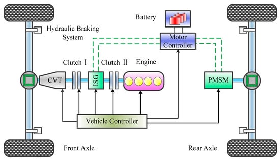 The structure of a plug-in hybrid vehicle, as shown in Figure 1, mainly includes an engine, an ISG motor, a permanent magnet synchronous motor (PMSM), a dual clutch, and an infinitely variable transmission (CVT). The front axle is driven by the engine and the integrated starter generator (ISG), the rear axle is driven by the PMSM, and the dual clutch is mounted on both ends of the ISG motor.