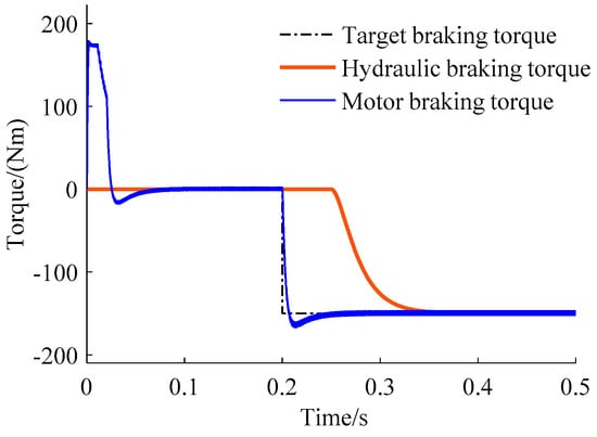 (2) Type two: braking mode switch with hydraulic braking system participation. Due to the different dynamic response characteristics of the motor and the hydraulic braking systems, this switch mode is difficult to coordinate. The idea of coordinating control is to take full advantage of the characteristics of the braking systems. The hydraulic system can provide large and stable torque, and the motor braking system’s torque response is quick and accurate, reducing the fluctuation of the vehicle.