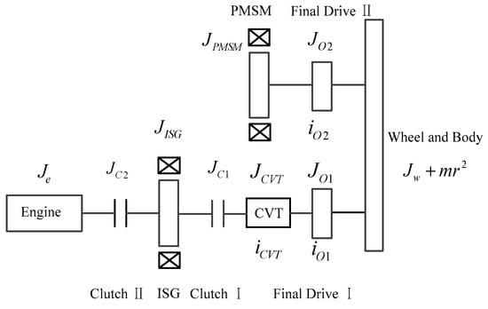 According to the braking force distribution control strategy mentioned above, there are four main braking modes: pure electric braking mode, motor and engine braking mode, motor and hydraulic braking mode, and hydraulic braking mode. In order to facilitate the kinetic analysis, the hybrid vehicle drive system model is simplified, as illustrated in Figure 5. where Je is moment of inertia of the engine; JISG is moment of inertia of the ISG; Jcvt is moment of inertia of the CVT; JC1 is moment of inertia of the clutch I; JC2 is moment of inertia of the clutch II; JPMSM is moment of inertia of the PMSM; Jw is moment of inertia of the wheel; JO1 is moment of inertia of the final drive I; JO2 is moment of inertia of the final drive II; m is the vehicle mass; r is the tire radius.