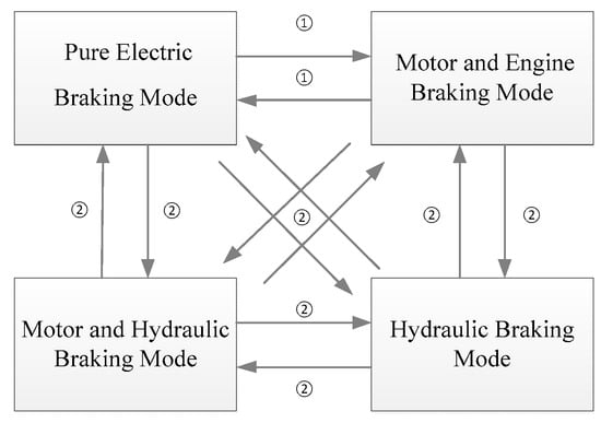 According to whether or not the hydraulic braking system is involved in braking, the braking mode-switch type is divided into two categories (Figure 6). Braking mode-switch coordination control strategies are developed for the different braking mode-switch types.