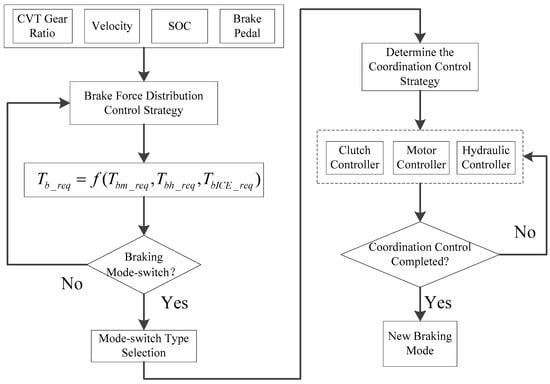 First, according to current speed, SOC, CVT ratio, and brake pedal, the braking force distribution control strategy allocates the target motor, hydraulic and engine braking torques; then, according to the braking mode boundary conditions the vehicle controller determines whether the braking mode should switch or not. If mode switching happens, the vehicle controller determines the type of mode switch and then selects the corresponding coordination control strategy and controls the clutch, motor and hydraulic torques to reduce the mode switch fluctuation. Finally, the vehicle controller determines whether the coordination control is completed, and if it is completed, the vehicle will enter a new braking mode.