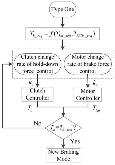 The coordinated control flow chart of type one is shown in Figure 8, km and kc are the change rates of motor brake torque and clutch hold-down force. Tbm and Tc are the actual torques of motor and clutch and Tbm = TbISGicvtio1 + TbPMSMio2. Tb is the actual total brake torque.