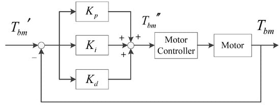 A motor torque proportional-integral-derivative (PID) control algorithm was designed in order to improve the hydraulic and clutch torque fluctuation and keep the total braking torque stable during the second stage. The PID algorithm’s control structure is shown in Figure 10. The input is Tbm′ which is the modified target braking torque of the motor while the output is Tbm which is the actual braking torque of the motor.