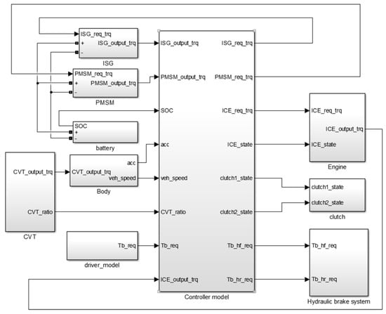 In this paper, the forward simulation model of plug-in hybrid vehicle is established based on MATLAB/Simulink, as illustrated in Figure 11. The vehicle simulation model is composed of ISG model, PMSM model, battery model, hydraulic braking system model and the controller model.