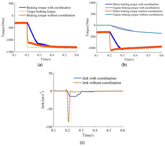 Simulation results of motor and engine braking mode to motor and hydraulic braking mode. (a) Total braking torque; (b) Motor, engine and hydraulic braking torque; (c) Vehicle jerk.