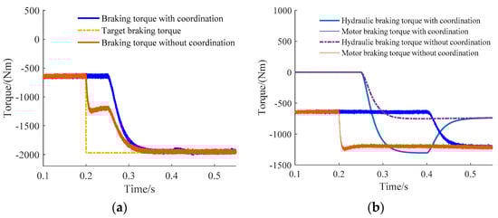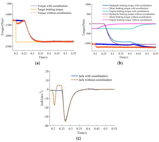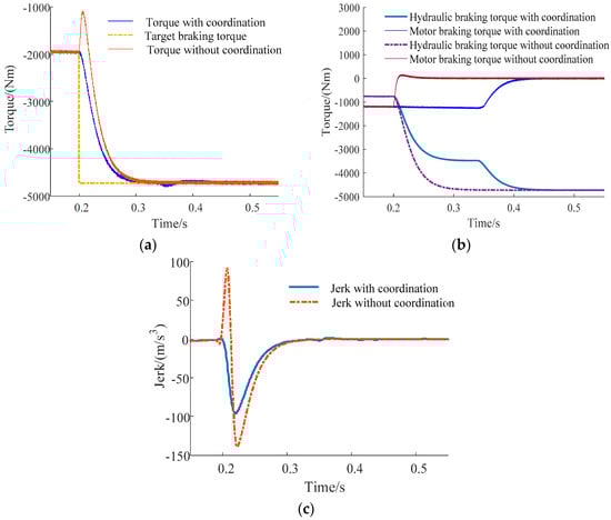 As shown in Figure 13, when the braking strength is changed from 0.1 to 0.3, the braking mode is switched from the motor brake to the motor and hydraulic brake. In the results without coordination the hydraulic system response was slower and the hydraulic braking system reached the target braking torque after the motor, therefore, it had a large impact on the vehicle. In the results with coordination the vehicle fluctuation was significantly improved by coordinating the motor and the hydraulic braking torque. However, a small fluctuation occurred at 0.42 s because the motor did not have enough ability to coordinate the change of the hydraulic braking torque. The jerk of a small fluctuation was less than 1.57 m/s3 and the effect of the coordinated control is pretty good.