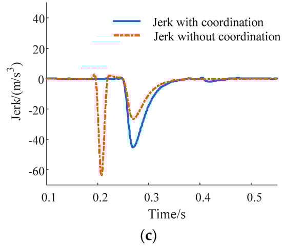 When the mode is switched from motor and hydraulic brake to hydraulic brake (Figure 15), the motor exits the regenerative brake mode, the motor braking torque drops suddenly and the hydraulic braking torque rises slowly. The vehicle jerk without coordination can reach 138.4 m/s3 and the ride comfort is seriously worsened. However, the jerk with coordination is less than 95 m/s3.