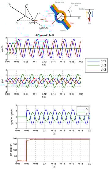 It is necessary to note that ANSI 67N protection is an extension of the ANSI 50N/51N [12] in which it only checks the earth fault current level versus a threshold. Figure 1 shows an example of waveforms in case of phase 2 earth fault in a 3-phase system. The fault occurs in the time 0.06 s where the voltage in phase 2 drops and the fault current flow in the same phase to earth, increasing to maximum value (the current and voltage values depend on the neutral system chosen, R/L relation and I-V angle in that instant). Also, the relation between the residuals current and voltage (polarization magnitude) and their angles difference is shown.